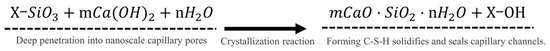 The reaction mechanism of permeable crystalline material-enhanced recycled aggregate is presented in Figure 17 and Figure 18. Additionally, Figure 19 shows the surface of the modified recycled aggregate, observed using a high-magnification electron microscope. After modifying the aggregate with permeable crystalline materials, a chemical reaction occurs between the calcium ions in the mortar and the modified material, resulting in the generation of C-S-H crystals. These crystals fill the internal pores and micro-cracks of the mortar, which inhibits crack formation and reduces porosity. As a result, this process enhances the density of the recycled aggregate structure. Moreover, Figure 20 shows that unreacted sodium silicate directly fills the pores and micro-cracks of the old mortar, reducing the volume of larger pores and micro-cracks and decreasing the porosity of the recycled aggregate. Both effects combined result in the improvement of the pore structure of the recycled aggregate, leading to a more compact structure, reduced water absorption, and a lower crushing index. Consequently, the physical properties of the recycled aggregate are improved.