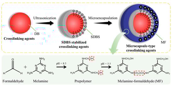Figure 1 shows that DB@MFs were prepared by in situ polymerization. Melamine reacts with formaldehyde through a nucleophilic addition reaction and forms hydroxymethyl melamine under alkaline conditions. At the same time, DB is added to the dispersant solutions, and ultrasonic treatment is used to form the DB suspension. By adding hydroxymethyl melamine solution to the suspension, the polycondensation of hydroxymethyl melamine can be carried out to build the formation of -O- or -CH2- bridge bonds under acidic conditions. With an increasing molecular weight, the water-solubility of polycondensation decreases. Eventually, an insoluble structure encapsulates the DB by forming a precipitate layer on the surface. In this reaction, the hydroxymethyl melamine has a positive charge via the electron-withdrawal of the hydroxymethyl groups under acidic conditions [,], thus creating an electrostatic interaction with the anionic surfactants and precipitating on the DB surface. Next, the chemical composition, morphologies, and mechanical properties of DB@MF were characterized.