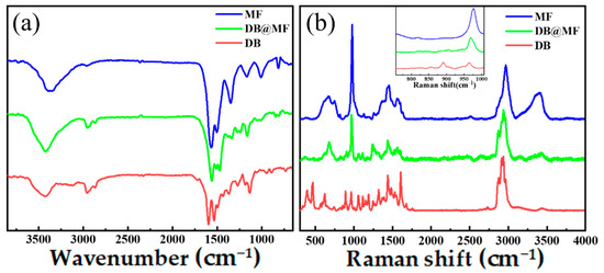 (a) FT–IR spectra and (b) Raman spectra of MF, DB@MF, and DB.