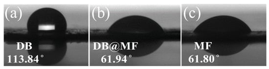 The WCA is an important parameter for evaluating the hydrophilicity and surface free energy of materials. As the WCA decreases, the material becomes more hydrophilic, and the surface free energy increases. Figure 3 shows that pure DB had a low surface free energy with a WCA of 113.84° (Figure 3a), indicating that DB has a hydrophobic surface. After pure DB was encapsulated by MF, it had a strong surface free energy due to the formation of hydroxymethyl melamine groups with powerful polarity. In this case, the WCA of DB@MF reached 61.94° and was similar to that of MF (Figure 3b,c), and the encapsulated DB turned from a hydrophobic surface into a hydrophilic surface. The above results indicate the presence of a well-covered MF coating on the surface of DB.
