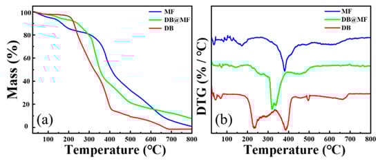 (a) Heat weight loss curves and (b) DTG curves of MF, DB@MF, and DB.