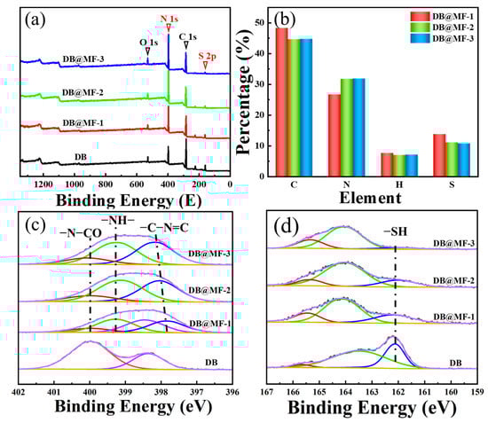 To quantitatively measure the elemental composition of DB@MF with different shell/core ratios, XPS and EA were used (Table S2). Figure 5a shows the scanning XPS spectra obtained from DB, DB@MF-1, DB@MF-2, and DB@MF-3. The peaks at 162 eV and 398 eV were assigned to S 2p and N 1s, respectively. The XPS results show that with the addition of MF, the S element became weaker, which was attributed to the better deposition of MF on the DB surface. The MF chemical structure was expected from the N 1s spectra in Figure 5c. Their respective binding energies were 398.2 eV (-C-N=C), 399.2 eV (-NH-), and 400.0 eV (-N-CO), where -C-N=C belongs to the nitrogen of the melamine ring structure, -NH- was attributed to the nitrogen of the amino groups, and -N-CO was added to nitrogen in urea. This is in agreement with the previous results, indicating the successful synthesis of MF resin []. In addition, the peak in the S 2p region at 162.1 eV (-SH) [] in Figure 5d was identified as sulfur in the thiols, indicating the presence of the crosslinking agents. However, as the addition of MF increased, the peak gradually disappeared, indicating that thiols were not detected within DB@MF. This indicates that the microcapsule structure of DB@MF was integrated, and the core content (Table S1) of DB@MF was obtained by Figure 5b and Formula (1).