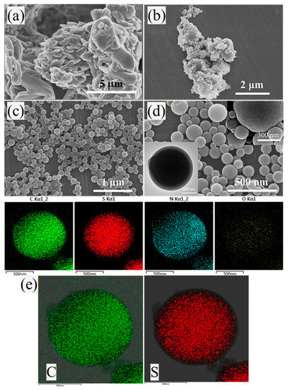 Additionally, in order to investigate the possible impact of the microcapsule morphology on subsequent experiments, SEM analysis was performed on all samples, as shown in Figure 6. Figure 6a represents pure DB and shows agglomeration between particles. Due to the lower amount of MF added, DB@MF-1 could not separate the nanoparticles of DB completely, resulting in the agglomeration of crosslinking agents. Additionally, Figure 6b shows the formation of DB@MF-1, consisting of partially agglomerated DB and microcapsules. After modification by MF encapsulation, the microscopy images demonstrate the successful synthesis of microcapsules of uniform size. The size of the capsules is generally determined by emulsification technology, with particle size being reduced by vigorous emulsion or ultrasonic techniques, and shell thickness being determined by polymer solution concentration. With different reaction conditions (Table S1), the size range of these capsules is approximately 190–1300 nm (Figure 6 and Figure S2). Due to agglomeration, the particle size of DB@MF-1 is significantly larger than those of DB@MF-2 and DB@MF-3, with the particle size distribution being consistent with the SEM results shown in Figure S2. The TEM-EDX mapping analysis of DB@MF-3 shows that the sulfur element belonging to DB is inside the MCs (Figure 6e). In addition, Figure 6d demonstrates that DB@MF has a well-formed core-shell structure. The results presented above show that MF resin demonstrate that an effective and thick encapsulation layer was convincingly formed on the DB surface.