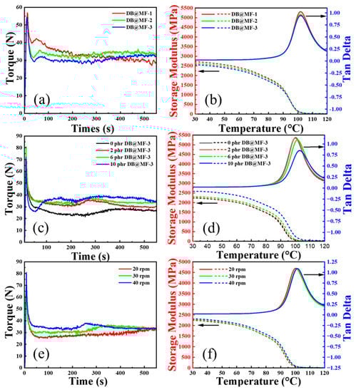 The torque diagram of PVC with (a) different shell/core ratios of DB@MF, (c) different additions of DB@MF–3, and (e) different processing speeds. The storage modulus and tan delta of PVC with (b) different shell/core ratios of DB@MF, (d) different additions of DB@MF–3, and (f) different processing speeds.