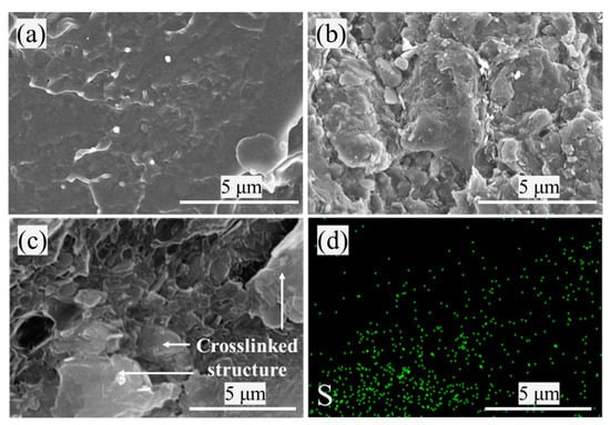 To elucidate the crosslinking behavior, a fractographic analysis was conducted. Figure 8a,b shows the fracture surface of PVC before and after crosslinking. The fracture surface of the 0 phr was smooth, and only part of the filler could be seen. The 10 phr had a rougher fracture surface, and crosslinked structures could be seen. The above phenomenon indicates a strong bond between PVC and the crosslinked structure. During stretching, the crosslinked structure tried to resist the deformation and broke away from the PVC matrix, leaving a rough fracture surface. Then, the 10 phr was analyzed by using SEM-EDX, and it could be seen that there were S elements belonging to DB in the crosslinked structure shown in Figure 8c,d, indicating that crosslinking agents were successfully released to react with the PVC, and the presence of crosslinked structures was found in the composite. In addition, the decomposition of PVC after crosslinking was improved (Figure S5), demonstrating that the crosslinked structure can improve the decomposition of PVC.