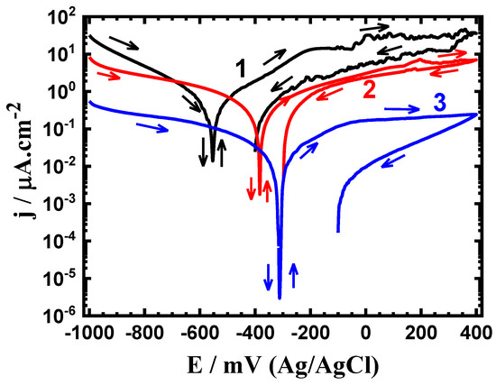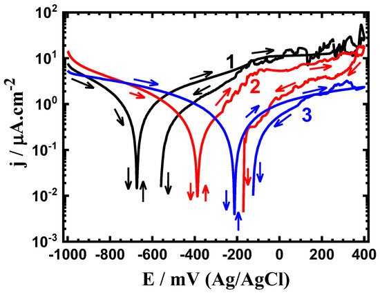 Cyclic potentiodynamic polarization (CPP) experiments were carried out to ascertain the effects of the Sn content and exposure duration on the electrochemical behavior of the sintered Ti-base alloys. The CPP curves for the sintered (1) Ti-Zr-Ta-4Sn, (2) Ti-Zr-Ta-6Sn, and (3) Ti-Zr-Ta-8Sn alloys after being submerged in SBF for one hour are shown in Figure 1. Additionally, other CPP curves were collected after 72 h, and the resulting plots are shown in Figure 2. The Tafel slopes of the cathode (βc) anode (βa), corrosion potential (ECorr), corrosion current density (jCorr), polarization resistance (RP), and corrosion rate (RCorr) that were obtained from the CPP data are shown in Table 1. The values of βc and βa were calculated from the slopes of the cathodic and anodic currents, respectively. The values of ECorr and jCorr were obtained from the intersection of the lines drawn next to the anodic and cathodic Tafel current regions. The values of Rp and RCorr were calculated from the values of βc, βa, and jCorr using the same procedures and equations described in [39].