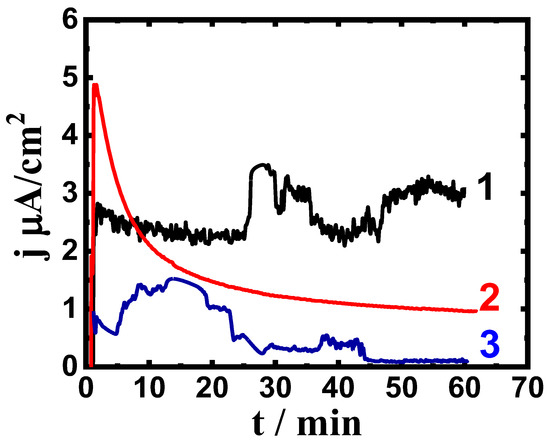 Chronoamperometric current with time (CCt) measurements have been utilized to report the corrosion of various metallic structures at a fixed anodic potential value [38,39,41]. Figure 3 represents the CCt curves for (1) Ti-Zr-Ta-4Sn, (2) Ti-Zr-Ta-6Sn, and (3) Ti-Zr-Ta- 8Sn that were obtained at 400 mV after one hour in the SBF solution, while Figure 4 displays the CCt curves that were obtained at the same value of potential for the same alloys after exposure for 72 h. These figures show increases in the initial current that resulted from the dissolution of the oxide from the surface; this oxide must have formed either in the air before the measurement or during immersion in the SBF solution. After a few minutes, the current gradually decreases as the alloys develop a thick corrosion product and/or oxide layer with time [37,39,41].
