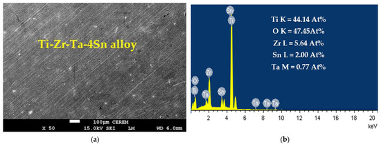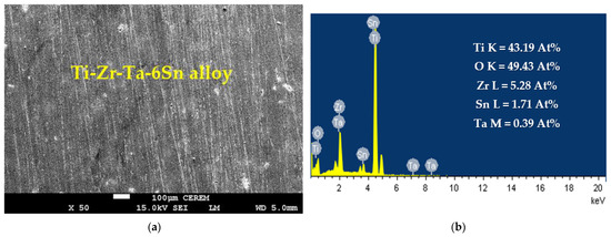 A similar SEM micrograph and EDX profiling for the alloy with 6% Sn were also taken, as shown in Figure 6. The image of this alloy shows that the surface does not show either uniform or pitting corrosion. This again supports the CCt experiment shown in Figure 7 (curve 2). The EDX profile also indicates that the surface of the alloy contained 43.19% Ti, 49.43% O, 5.28% Zr, 1.71% Sn, and 0.39% Ta. It is understood that Ti and O have the highest content, which is due to a considerably thick layer of TiO2 that was formed [39]. The presence of TiO2 decreases the obtained currents and leads to more passivation of the surface of the tested Ti-base alloy. It is also worth mentioning that the percentages of Zr, Sn, and Ta are lower than their original percentages within the alloy, indicating that the formed TiO2 layer does not allow the appearance of the other component of the alloy.