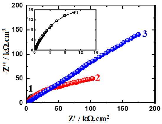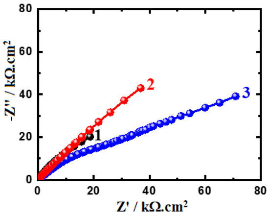 Nyquist graphs for (1) Ti-Zr-Ta-4Sn, (2) Ti-Zr-Ta-6Sn, and (3) Ti-Zr-Ta-8Sn in SBF after a one-hour immersion.