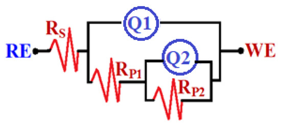 The EIS method has the ability to explain the reactions for the transfer of electrons at the interface of the Ti-Zr-Ta-Sn developed alloys and the SBF solution. The impedance technique has been utilized to investigate and report the phenomena of corrosion and its passivation under different experimental conditions [42,43,44,45]. Figure 8 displays the Nyquist spectra for the alloys (1) Ti-Zr-Ta-4Sn, (2) Ti-Zr-Ta-6Sn, and (3) Ti-Zr-Ta-8Sn in SBF solution for one hour. The Nyquist spectra after a 72-hour exposure are also plotted, as seen in Figure 9. The data presented in Figure 8 and Figure 9 were fitted to the circuit model shown in Figure 10. It is worth confirming that the equivalent circuit model shown in Figure 10 has been cited in many research studies [33,41,44]. The elements of the circuit are RS as the solution resistance, Q1 and Q2 as the first and second constant phase elements, and RP1 and RP2 as the first and second polarization resistances [39,41].