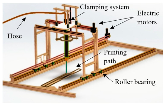 In order to develop a 3D mortar mix with acceptable pumpability, printability, and workability firstly, the materials’ compatibility with the printer components should be checked, as should the storing, delivering, and printing conditions. A custom-made, small-scale gantry printer was utilized for the studies presented in this paper. The printer configuration is depicted in Figure 1. Although the small-scale printer was capable of producing high-quality results, future studies will require the use of a larger printer to accommodate bigger print jobs.