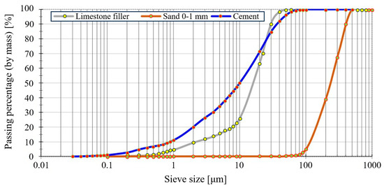 Natural quartz sand 0–1 mm; CEM II/A-S 52.5 R Portland slag cement, in line with CP 012-1:2007 [52], NE 013:2002 [53], GP 075:2002 [54], and ATE 004-07/1707-2022 [55]; and limestone filler from a local quarry basin were used as the main components for the preparation of the cementitious mortars. The CEM II/A-S 52.5 R Portland slag cement consists of 85% cement clinker, 12% blast-furnace slag, and 3% minor auxiliary components. The particle size distribution of the component materials is illustrated in Figure 2.