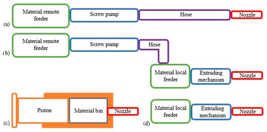 Material system and feeder configuration: (a) remote feeder, (b) remote and local feeder, (c) ram extruder, (d) local feeder.