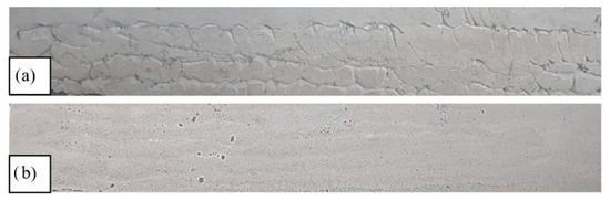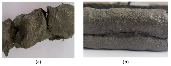 Lateral view of printed elements: (a) M4 mix—difficult extrusion (clogging issues), (b) M28 mix—smooth extrusion.