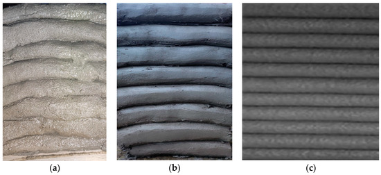 The buildability test: (a) M20 mix—photo taken just before collapse (large deformations occurred in the lower 3 layers), (b) M27 mix, 45 mm nozzle—high buildability (over 100 layers), (c) M28 mix, 20 mm nozzle—high buildability (over 100 layers).