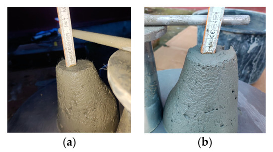 The values listed in Table 2 were determined by performing tests in accordance with the European Standard EN 12350-2:2019 [70]. The slump was determined as the difference in height between the original height of the cone and the height of the 3D mortar after deformation (Figure 12). According to previous studies, the mixtures were fine-tuned to obtain values ranging from 40 to 60 mm [71].