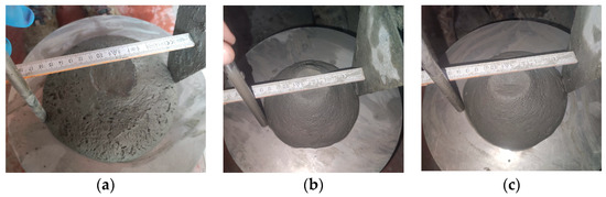 Slump flow test: (a) M17—very fluid mix, (b) M20—fluid mix, (c) M28—fluid and printable mix.