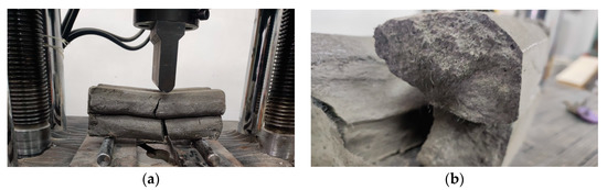 Specimen manufactured with M28 mix and printed with the 20 mm nozzle: (a) set-up, (b) failure mode.