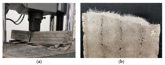 Specimen manufactured with M28 mix and printed with the 20 mm nozzle: (a) failure mode, (b) orientation of fibers.