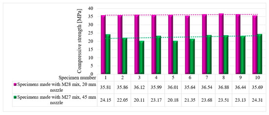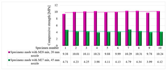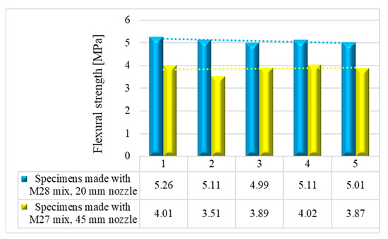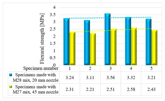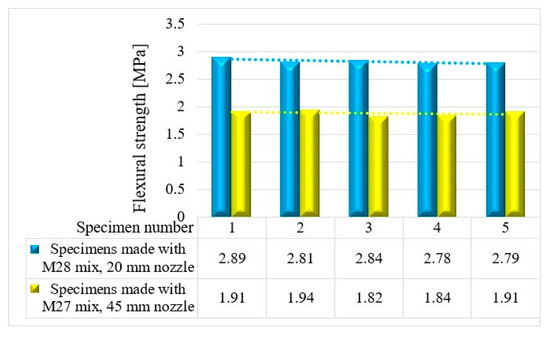 Based on the results presented in Table 2 (extrudability, buildability, and flowability), it was found that the M27 and M28 mixes possessed the most favorable properties for 3D printing. Consequently, mortar specimens were prepared and tested for their compressive and three-point bending strengths (Figure 26) using two nozzle dimensions (20 and 45 mm).