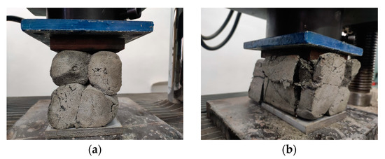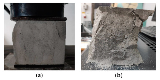 The compressive tests were conducted on cubic specimens at 24 h and 7, 14, and 28 days following the standard presented in [74]. For each specific time interval, 10 specimens manufactured with the M28 mix and printed with the 10 mm nozzle and 5 specimens manufactured with the M27 mix and printed with the 45 mm nozzle were tested (Figure 20 and Figure 21). The load rate was maintained at 0.5 kN/s during the test. The data were automatically recorded by a data logger and transferred to a computer.
