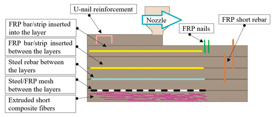On the other hand, in order to ensure the ductility of the 3D-printed structures, as well as to fulfill certain conditions referring to the mechanical characteristics, various reinforcement methods have been proposed and analyzed by researchers [31]. Based on the literature review, some of the most investigated reinforcements that are suitable for 3D-printed mortars include polymer fibers (polypropylene, glass, and carbon), metallic fibers, steel bars (placed before or during the printing process), polymer or steel meshes (placed before or during the printing process), nails or short rebars (placed perpendicular to at least two consecutive layers of the printed material), U-shaped nails (placed in a specific pattern on each layer of material), tensioned strands (similar to reinforced concrete post-tensioned members), and steel cables (capable of following the printing path) [32,33,34,35,36,37,38,39,40,41,42,43,44,45,46,47,48,49,50,51].
