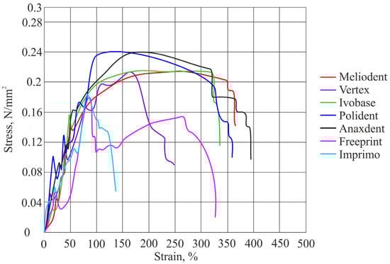Graph showing tensile stress as a function of strain with average values obtained for the soft liner.