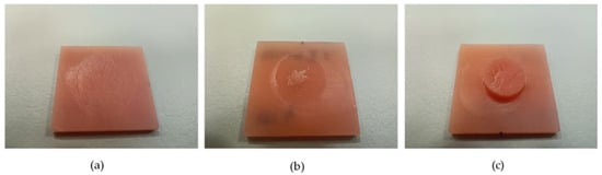This study was performed according to the specification ISO No. 10139-2:2016 [34]. Plates with dimensions of 25 ± 3 mm × 25 ± 3 mm and a thickness of 3 ± 0.5 mm, composed of denture base material, were the basis for specimen preparation. The flat surfaces of the plates were kept plane-parallel and wet-ground with standard P500 metallographic grinding paper. After the preparation of the plates, they were stored in a water bath at 37 ± 1 °C for 30 ± 2 days.