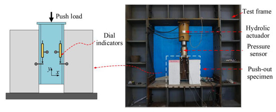 Fifteen push-out specimen tests were performed by Zou [25] to study the effect of the geometry of B-SCs on their shear behaviour. Figure 2 and Figure 3 show the test setup and geometric dimensions of the specimens manufactured in accordance with Eurocode 4 [31], respectively.