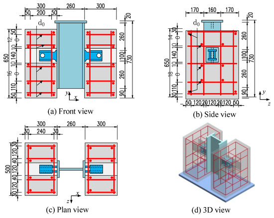 Each push-out specimen consisted of a 620 mm high H-steel beam (260 × 160 × 20 × 20 mm), two precast concrete slabs (500 mm × 300 mm × 650 mm), and two B-SCs. The pressuring-bearing plates and shear plates were made of Q345 and Q420, respectively [32]. Full penetration welding and fillet welding were used between the B-SCs and the steel beams, shear plates and pressure-bearing plates, respectively. The weld leg length of fillet welding was 16 mm. Figure 4 shows the structural details of the B-SCs.