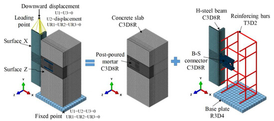As shown in Figure 6, three types of elements were applied for meshing. The B-SC, concrete slab, post-poured mortar, and steel beam were meshed with solid elements (C3D8R), which not only prevented shear-locking difficulties but also provided reasonable accuracy when compared with other element types [27,28,29]. The reinforcing bars were meshed using truss elements (T3D2) [27,28,29]. The rigid element (R3D4) was meshed the for base plate. The mesh size varied with the geometric size and importance of different parts. For example, the global and local seed sizes for the concrete slab and steel beam were 15 and 5 mm, respectively. To maintain the continuity of the element sizes and improve the convergence of the FE model, the mesh sizes of the B-SC and reinforcing bars were 5 and 15 mm, respectively.