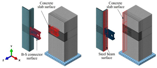 In this study, two types of contact properties were employed for the interaction. First, contact interactions were used at the interface of the above-mentioned components, as shown in Figure 7. The normal “hard” contact and tangential “penalty” frictional formulation were considered for the first contact interaction. The friction coefficient between the steel beam and concrete slab was 0.6 [27,28], and that between the other components was 0.25 [28,29]. The reinforcing bars were “embedded” in their surrounding concrete.