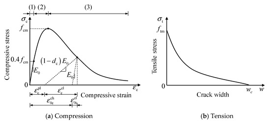 Figure 9a,b present the uniaxial compression and tension behaviours of concrete, respectively. The stress–strain curve of the concrete under uniaxial compression is separated into three stages, as illustrated in Figure 9a. The first stage is linear () [36].
