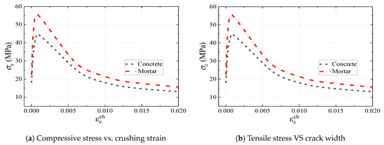 In Equation (4), . The peak strain ɛcm corresponding to the peak stress fcm was equal to 0.025 [36]. is a coefficient. The third (descending) stage considers the dependency of the specimen geometry to ensure almost mesh-independent simulation results [37,38]: