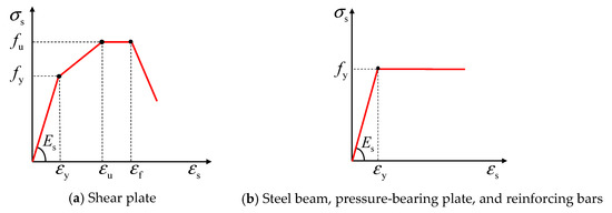 Figure 11 presents the stress–strain relationship for steel. As shown in Figure 11a, the descending branch of the stress–strain curve of the shear plate was used to simulate shear-plate failure [27,30]. The ultimate strain εu and fracture strain εf of the shear plate used in the FE model were 0.13 and 0.135, respectively. As shown in Figure 11b, the ideal elastoplastic bilinear model was adopted to model other steel components except the shear plate [30,31].