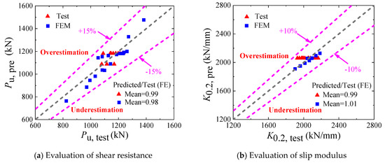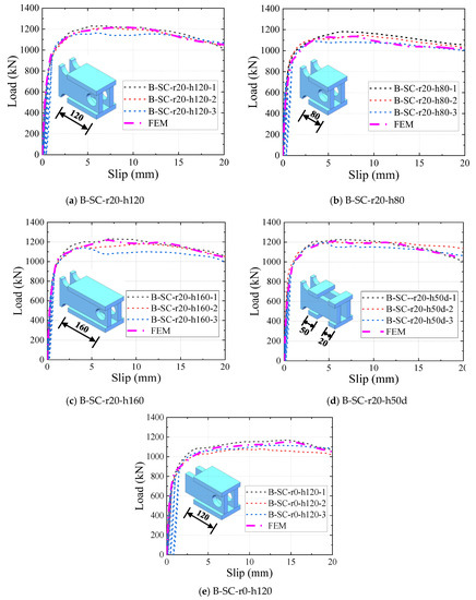 The results of push-out tests were used to validate the effectiveness of the numerical model. A comparison between the ultimate shear resistance and slip modulus of the B-SCs in tests and numerical analysis, listed in Table 1, shows a high agreement for all push-out specimens, with a maximum deviation of 6% found for B-SC-r20-h160-3. The mean value of was 0.99 with a standard deviation of 0.03 and the mean value was 1.00 with a standard deviation of 0.03. This demonstrates that the established numerical model can effectively perform a parametric study on the shear resistance and slip modulus of the B-SCs.