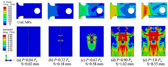 When P = 0.63 Pu and slip = 0.58 mm, plastic deformation occurred locally in the push-out specimen. As shown in Figure 15c, the local stress in the anchorage and shear zones of the B-SC was larger than the yield strength owing to the combined action of bending and shear. The existing cracks in the concrete slab near the B-SC continued to extend under the action of the load and the cracked area extended from the post-poured high-strength mortar to the precast concrete slab.
