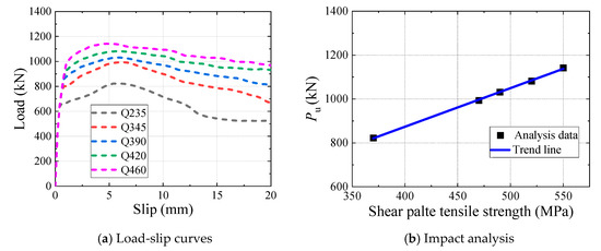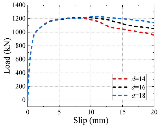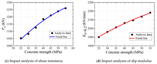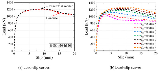 As shown in Figure 17a, when the numerical model included and excluded the postpoured high-strength mortar, the two load-slip curves almost coincided, which was consistent with Yu’s conclusion [43]. For conservatism and simplicity, high-strength mortar was not included in the subsequent parametric analysis. A comparison of the load-slip curves for different concrete strengths (25 MPa–55 MPa) [36] is illustrated in Figure 17b. As shown in Figure 17b,c, the ultimate shear resistance and slip modulus of the B-SCs increased as the concrete strength increased. According to Figure 17b, the ductility of the B-SCs also increased as the concrete strength increased, which confirmed the conclusion of Oehlers [44].