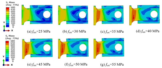 Figure 18 presents the stress distribution of the B-SCs for different concrete strengths in the ultimate state. When the concrete strength increased, the shear deformation and high-stress area of the shear plate in the ultimate state also increased. This can be attributed to the increase in the cracking resistance of a precast concrete slab with the increase in concrete strength. Higher-strength concrete enables concrete to support greater shear deformation of the shear plate, which increases the contribution of the shear plate to the shear resistance of B-SCs, thereby improving the ultimate shear resistance of B-SCs.