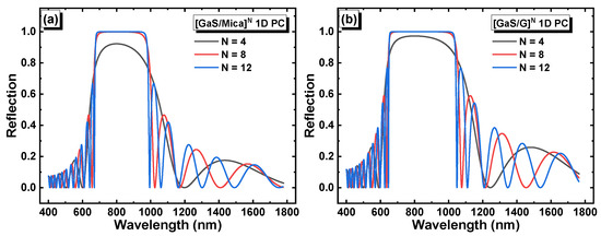 In the absence of a defect layer, the 1D PCs are expected to exhibit a photonic band gap, which corresponds to the range of wavelengths at which light transmission is prohibited or strongly suppressed. Figure 2a,b depict the reflection of light as a function of the wavelength and the number of periods N in the structures [GaS/Mica]N and [GaS/G]N, respectively. In the second structure, layer G refers to a solution with zero glucose concentration (i.e., distilled water in this case).