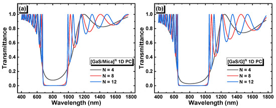 The corresponding transmittance in each structure is shown in Figure 3a,b. The [GaS/Mica]N and [GaS/G]N structures had band gap widths of 0.61 eV and 0.73 eV, respectively, at a period number of 12. Additionally, both structures, [GaS/Mica]12 and [GaS/G]12, exhibited well-defined band gaps in the visible to near infrared range, which makes them suitable for opto-sensing applications. The significant values of the photonic band gaps were due to the substantial refractive index difference between GaS and mica in the [GaS/Mica]12 structure, as well as the refractive index difference between GaS and distilled water in the [GaS/Water]12 structure.