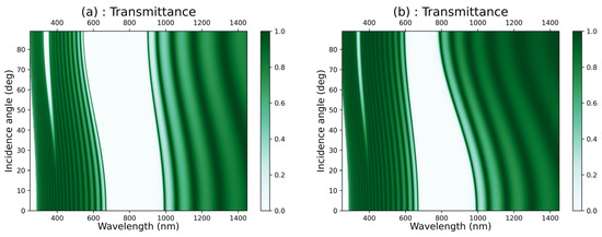 Colormap plot of the transmittance versus the wavelength and the incidence angle of light in [GaS/Mica]12 in the case of (a) TE polarization mode and (b) TM polarization mode.