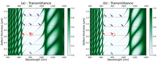 Colormap plot of the transmittance versus the wavelength and the defect thickness in (a) [GaS/Mica]6D[GaS/Mica]6 and (b) [GaS/water]6D[GaS/water]6; D refers to distilled water.