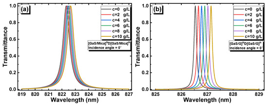 The optical characteristics of [GaS/Mica]6D[GaS/Mica]6 and [GaS/G]6D[GaS/G]6 were studied at different values of glucose concentration (0, 50 g/L, and 100 g/L). It is important to note that both D and G layers can be filled with the target solution, but they have thicknesses of 640 nm and 150.1 nm, respectively. The values of the glucose concentration were chosen to be large enough to illustrate the shift of the resonance peaks. Figure 7a,b represent the superimposition of colormap plots, illustrating the transmittance at various glucose concentration levels as a function of wavelength and incidence angle of light in [GaS/Mica]6D[GaS/Mica]6 and [GaS/G]6D[GaS/G]6, respectively. Areas highlighted with red lines in Figure 7a,b indicate non-relevant regions. As can be seen in Figure 7a, it is easy to differentiate between the resonance peaks associated with varying glucose concentrations. In other words, the shift of the resonance peak is clearly discernible. In Figure 7b, three groups of peaks can be observed, namely the first resonance peaks, the second resonance peaks, and the third resonance peaks, which are associated with varying glucose concentrations. Among these, only the peak in the middle exhibits a clear shift due to its very narrow width. Therefore, in the subsequent section, we will focus on the peaks observed at around 820 nm (indicated by the red arrows in the same figures) and analyze their shift as a function of the incidence angle of light and solution concentration. As the incidence angle of light increases, the peaks of the resonance modes shift to lower wavelengths. The shift can be explained by the Bragg–Snell equation [32] given by , where m is the constructive diffraction order, d is the period, is the effective refractive index, and is the incidence angle of light. The peaks narrow as the incidence angle increases, indicating a low full width half maximum (FWHM) and thus better biosensing performance.