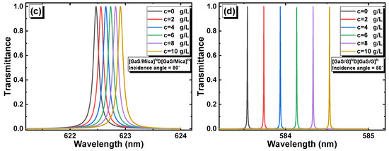 Diabetes was defined in accordance with the American Diabetes Association criteria [33], which specify that fasting blood plasma glucose levels are ≥126 mg/dL (≥1.26 g/L) and non-fasting plasma glucose levels are ≥200 mg/dL (≥2 g/L). In this study, we established a fixed threshold value for the glucose concentration at C = 2 g/L. The performance of the 1D PC biosensors was investigated at this threshold value as well as at higher concentrations (C = 0, 2 g/L, 4 g/L, 6 g/L, 8 g/L, and 10 g/L). We examined the shift of the resonance peaks in [GaS/Mica]6D[GaS/Mica]6 and [GaS/G]6D[GaS/G]6 as a function of the glucose concentration at incidence angles of 0° and 80° (Figure 8a–d). The resonance peaks were red-shifted as the concentration increased according to the standing wave condition [34] given by , where is the optical path difference, is an integer, is the effective refractive index which changes linearly with the glucose concentration, and represents the geometrical path difference. The resonance peaks in the [GaS/G]6D[GaS/G]6 structure were narrower compared to those in the [GaS/Mica]6D[GaS/Mica]6 structure, which corresponded to low FWHMs. As the incidence angle increased to 80°, the FWHMs of the resonance peaks in both structures decreased. This indicated that the peaks became narrower, suggesting improved resolution and potentially enhanced biosensing performance.