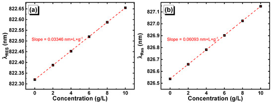 Position of the resonance peak versus the glucose concentration in (a) [GaS/Mica]6D[GaS/Mica]6 and (b) [GaS/G]6D[GaS/G]6.