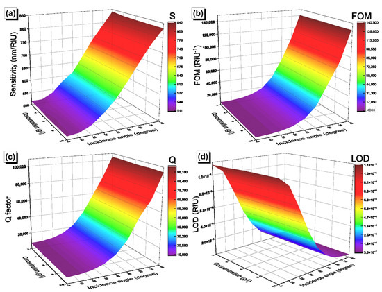 The performance of our biosensors was evaluated by calculating the sensitivity (), the figure of merit (), the quality factor (), and the limit of detection (). The sensitivity was calculated using the equation , where represents the value of the concentration, which varies between 2 to 10 g/L; is the position of the resonance peak at concentration ; and is the corresponding refractive index of the solution. The variation of the sensitivity as a function of the glucose concentration and incidence angle in [GaS/Mica]6D[GaS/Mica]6 and [GaS/G]6D[GaS/G]6 is shown, respectively, in Figure 10a and Figure 11a. The sensitivity of each biosensor shows a linear dependence on the concentration and a sigmoid-like dependence on the incidence angle, with maximum values of around 370 nm/RIU and 832 nm/RIU in [GaS/Mica]6D[GaS/Mica]6 and [GaS/G]6D[GaS/G]6, respectively. In addition to the sensitivity, the figure of merit (), the quality factor (), and the limit of detection () are given by the equations:
