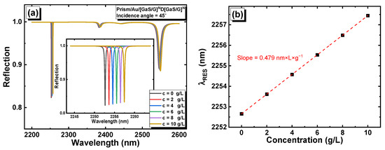 (a) Reflection versus the wavelength and glucose concentration in prism/Au/[GaS/G]6D[GaS/G]6; and (b) position of the resonance peak versus the glucose concentration.