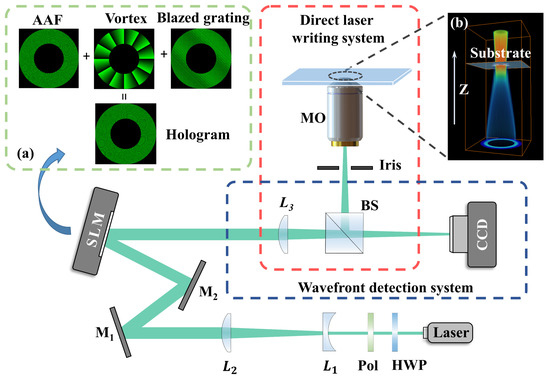 f3 = 1000 mm) and the Microscope Objective (MO) (Olympus 50×, NA = 0.8) formed a relay optical system to shrink the AAFV beams, which guaranteed a higher energy density and direct writing resolution. The wave-front-detection system consisting of L