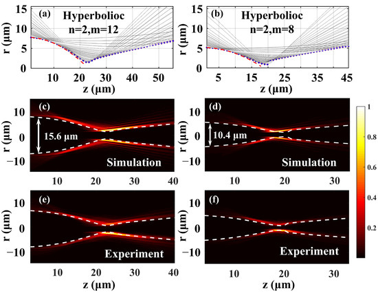 Figure 2c,d numerically depict the propagating features of the AAFV beams. The lateral accelerating caustic of the AAFV beams is evident, indicating that the energies in the main ring concentrate along propagation in an accelerated manner. Close to the focal plane, the power of the AAFV beams was confined in a small ring. After focusing, the ring intensity began to attenuate. All the experimental results (